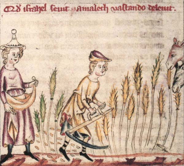zu sehen und weiter rechts ein Amalekiter erntet schon das reife Getreide