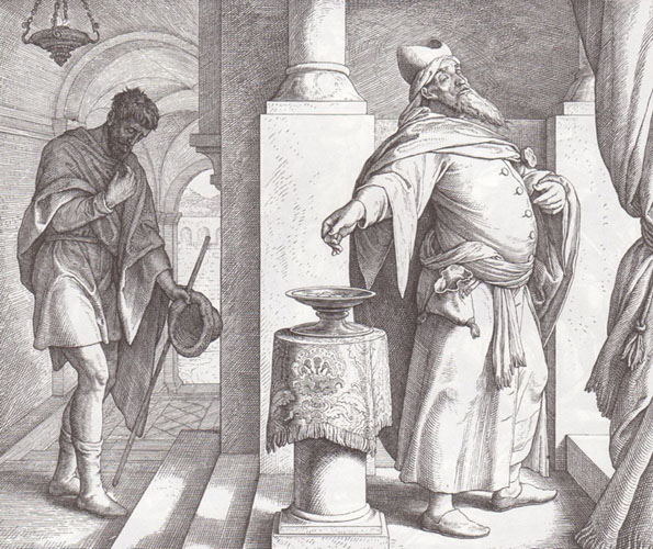 ukazuje obydwu mężczyzn w Świątyni. Faryzeusz wrzuca akurat monetę do