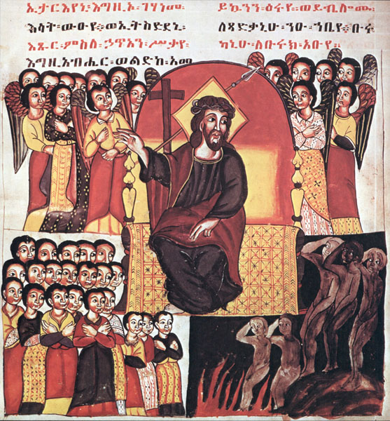 mężczyzn, a w prawej potępionych w ogniu. Pan błogosławi lewą grupę