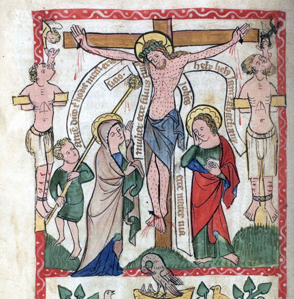 rechts von ihm Maria und links Johannes. Die Spruchbände mulier ecce filus tuus