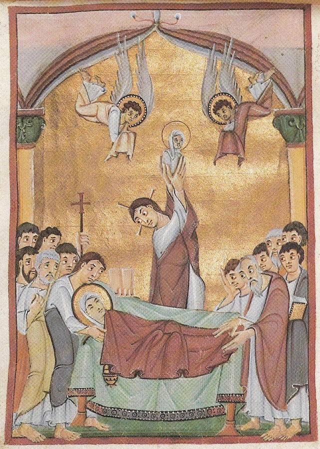 79v) z ewangeliarza z Reichenau ukazuje śmierć Maryi. Ten iluminowany