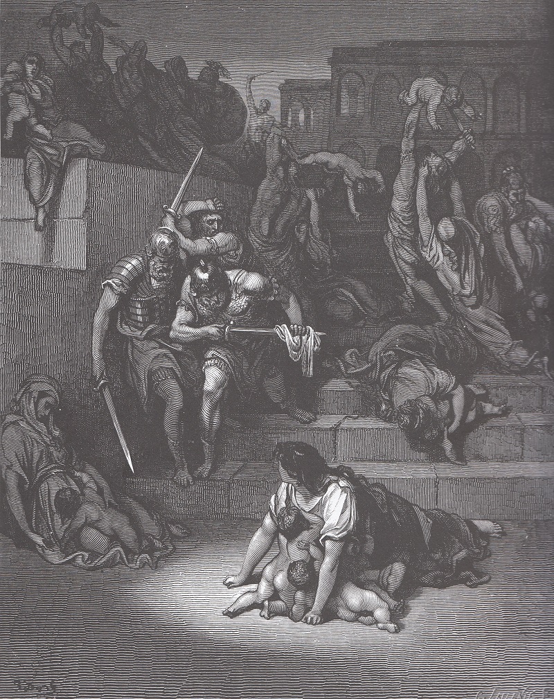 chłopcy akurat są przebijani mieczem przez żołnierzy, a inni już nie