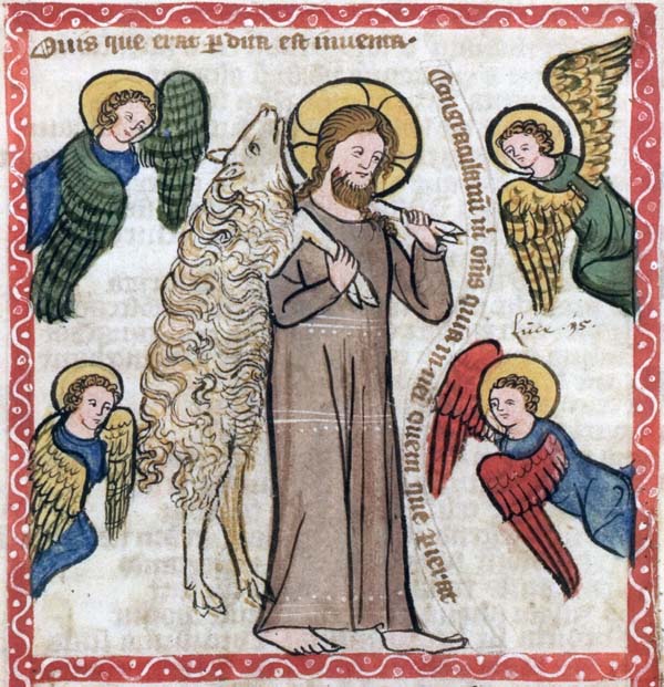 (fol. 63r) zeigt Jesus, der ein Schaf auf seinen Schultern trägt.