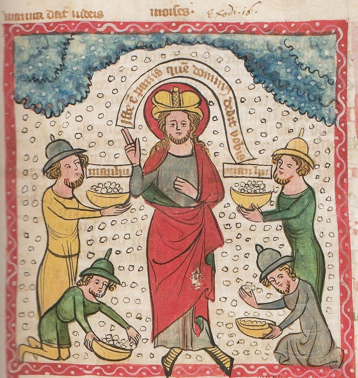 ukazuje w środku Mojżesza. Tytuł u góry obrazu brzmi: Manna